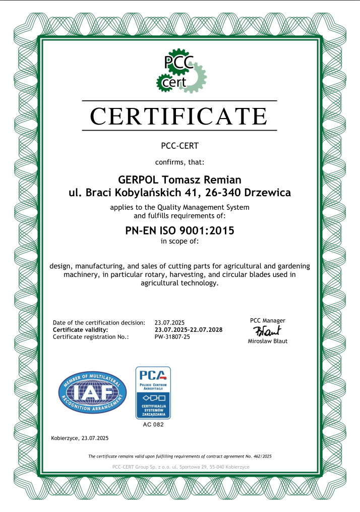Dzisiejszy GERPOL to firma rodzinna powstała w 2013 roku na bazie GERPOL Sp. Z O.O. powstałego z wydziału Noży Żniwnych w spółce GERLACH S.A., w którym to części tnące dla rolnictwa produkowane były blisko 60 lat. Przejęliśmy nie tylko maszyny, urządzenia oraz know-how, ale także doświadczoną załogę. To właśnie wskazani pracownicy są największym atutem naszej firmy. Załoga lojalna, z ogromnym doświadczeniem i zaangażowaniem oraz wysokich kwalifikacjach gwarantuje jak zawsze wyrób doskonałej jakości.